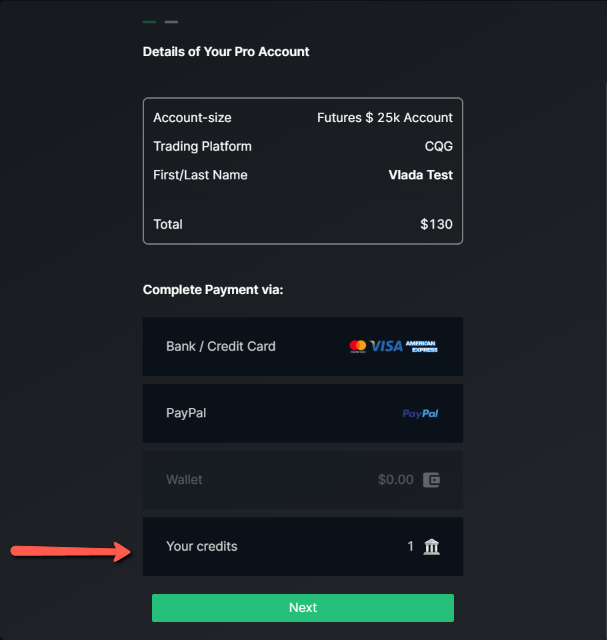 2. When asked to choose a payment method, select Your credits. The credit will be automatically added to your dashboard once you successfully pass the test and your PRO account is approved.